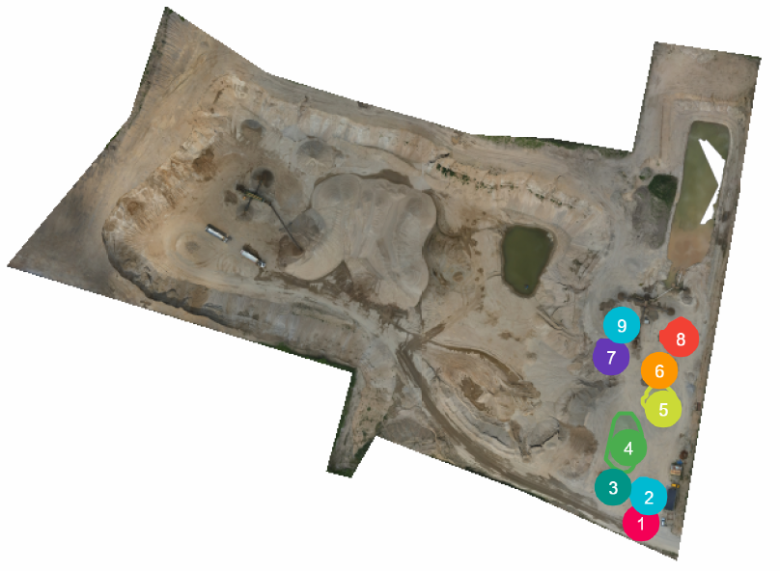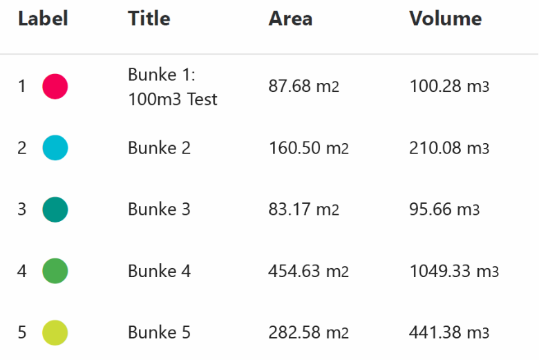 I rapporteksemplet følger volumenberegning for i alt 9 bunker, som blev opmålt over den samme droneflyvning.